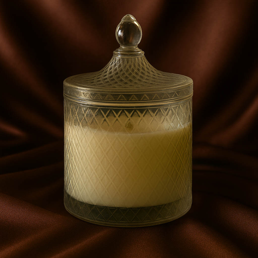 • Vessel: Diamond-cut glass jar with lid — timeless and refined