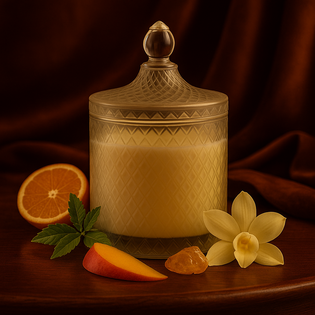 Mahogany Bliss opens with a bright kiss of mandarin and verbena, then melts into mango skin and golden amber as vanilla orchid lingers like a secret shared between two. In a room draped in rich mahogany and velvet, the glow turns warm and intimate, soft yet sultry. Citrus sparkles fade, woods and amber embrace, and the orchid hushes the air. Light it for slow conversations, silk smooth playlists, and the quiet promise of staying a little longer together this evening.